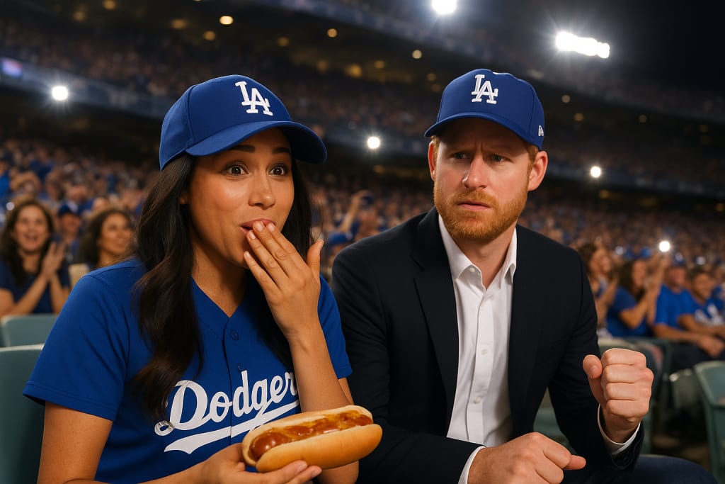 Under the blinding lights of the World Series, a familiar face appeared — Meghan Markle, dressed head to toe in Dodgers blue, flashing her signature Hollywood smile. Beside her sat Prince Harry, looking every bit the supportive husband and slightly confused foreigner. Cameras clicked, screens glowed, and within hours, the footage was everywhere. What looked like a simple night at the ballpark quickly morphed into a full-scale PR performance.