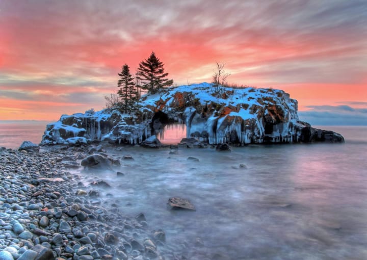 It had no end, fusing with the sky on the horizon. The cliffs framed the harbor and somewhere from around them the wind blew and rolled tiny snow spheres over the surface of the ice. If you stood on top of the hill, overlooking the pond you could see the tip of the Hollow Rock on the edge of the lake; An odd little mound that grew five or six pine trees was surrounded by a maze of sharp stone pillars. And then I saw him.