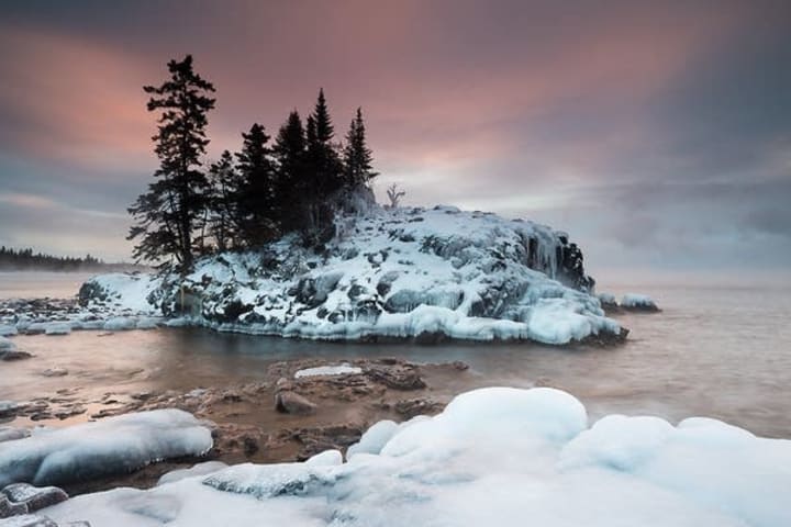 The yellowed lace curtains closest to the fireplace smell of cedar and smoke. If you pull them aside and look between the paw-like branches of goliath pine trees, beyond the mounds of snow, glistening in the morning Sun, you will see the lake.