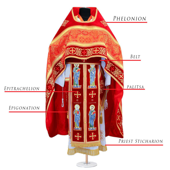 The cut of the phelonion resembles a cloak in the form of a circular fabric cut with an opening for the head, which the apostles wore. This serves as a reminder of the apostolic succession of the priesthood and makes the priests the primary preachers of the word of God. In addition, the loose vestment without fasteners symbolizes the purple robe that was put on the Lord Jesus Christ during the trial before Pilate.