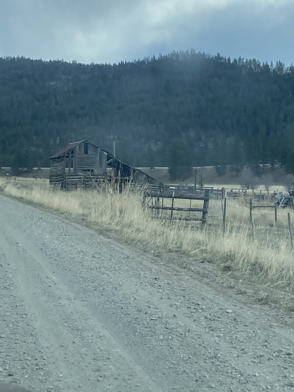 As I waited to be called for breakfast, I began exploring the outside of the cabin. A large van sat outside the front door of the cabin about 10 feet away. Beyond that was a giant field, with a gravel road on the other side. It curved around a bend and disappeared into the hills.