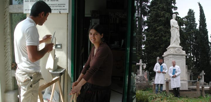 So you hired Roma to help you restore the Cemetery. You sent Daniel to apprentice with one of the last master stone carvers and restorers, Alberto Casciani, in Florence. Casciani couldn't find any young Italians who wanted to learn his art and he feared his skills would die with him. He welcomed his new student. Daniel learned how to restore period sculpture and marble using contemporary techniques, and began to restore the many graves in the cemetery.