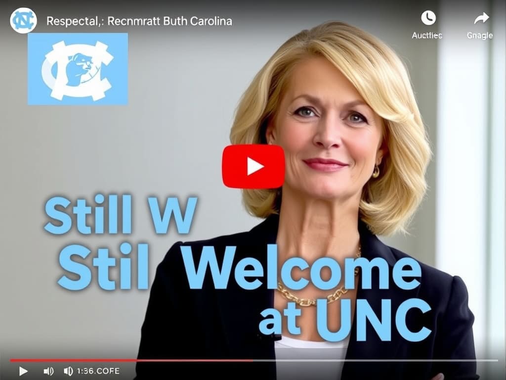 Create a professional and clean YouTube-style thumbnail image featuring a photo-realistic image of a confident, elegant woman resembling Linda Holliday (blonde hair, fashionable outfit), standing in front of a subtle University of North Carolina backdrop—like the Old Well or campus buildings. Overlay the text: “Still Welcome at UNC” in bold, light-blue and white college-style font. Include a small inset image of a football silhouette or coach’s clipboard to allude to Belichick without showing him. The tone should be respectful, modern, and attention-grabbing.