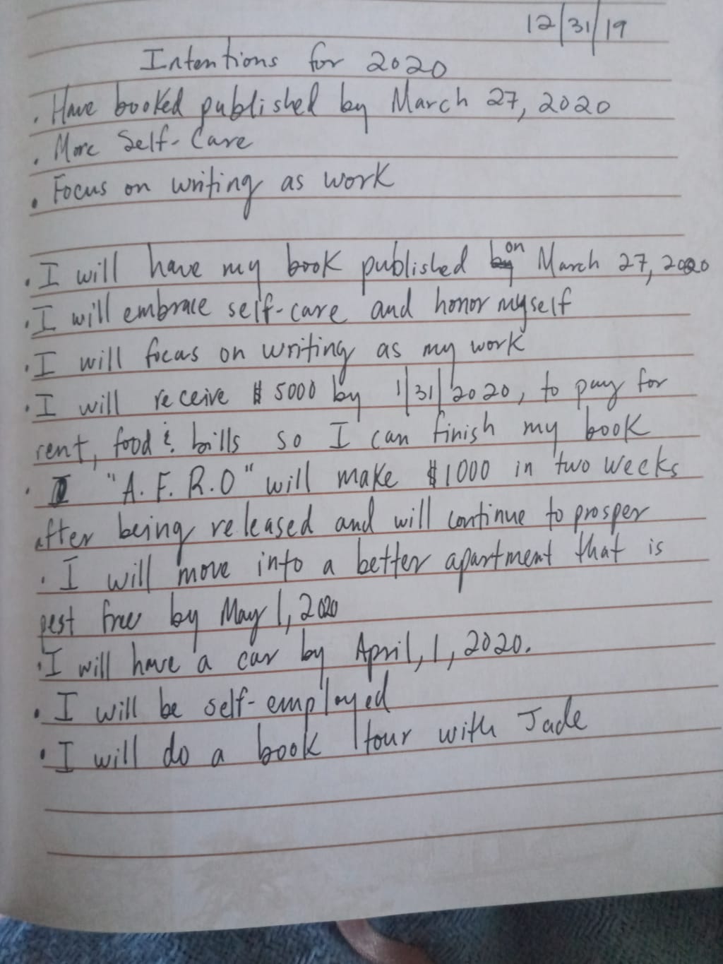At the end of 2019, I created a list of things I wanted to manifest in the new year. I wrote them down in my journal and from there I created my ritual of bringing in the new year. I put all my intentions one by one on a piece of bay leaf. Then, I stood outside and prayed to my ancestors while I allowed the sage to burn and the smoke to protect me from any negative energy along with some tobacco and palo santo. Afterwards, I spoke my intentions out loud before I burned each individual bay leaf in the fire. I was done shortly after midnight and it was now 2020 and I felt like great things would be coming my way.