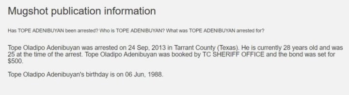 Tope Oladipo Adenibuyan was arrested on 24 Sep. 2013 in Tarrant County (Texas). He is currently 28 years old and was 25 at the time of the arrest. Tope Oadipo Adenibuyan was booked by TC SHERIFF OFFICE and the bond was set for $500.
