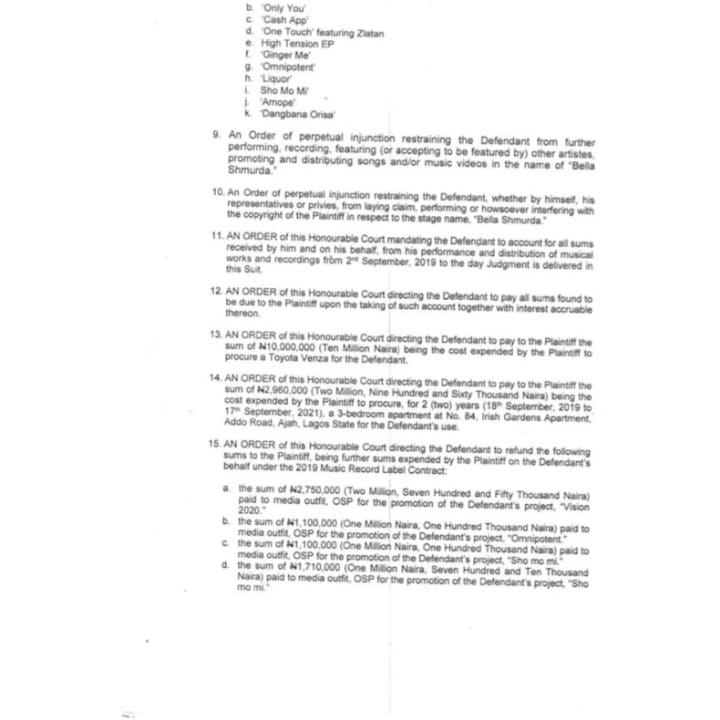 Nigerian singer Bella Shmurda earlier this year got sued by his record label for copyright infringement and breach of contract. The label, One World Global Records, claims that Bella has contrary to the provisions of the contract, been engaging in the release, publication, distribution and promotion of songs and videos without the consent and authorization of the label. According to them, the singer also failed to pay them royalties from the use of these songs he made while still under the label. The label also claim ownership of the trademark of the name, 'Bella Shmurda' and claim ownership to the copyright of all musical works and recordings released under or in connection to that name. Court documents from the proceeding have been released to the public. Here is one part of the document that outlines a number of the songs Bella is being sued for. The songs include, Vision 2020 Remix, Amope, Only You, Cash App, and more. You can find more of the document here.