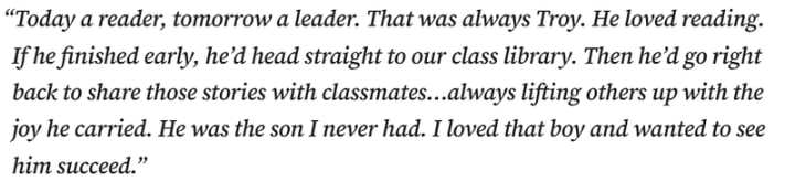In court, Troy’s teacher, Sheryl Reed, delivered a victim impact statement that moved everyone in the courtroom. Her words captured the profound loss and heartbreak caused by his death, leaving those present visibly shaken. She read: