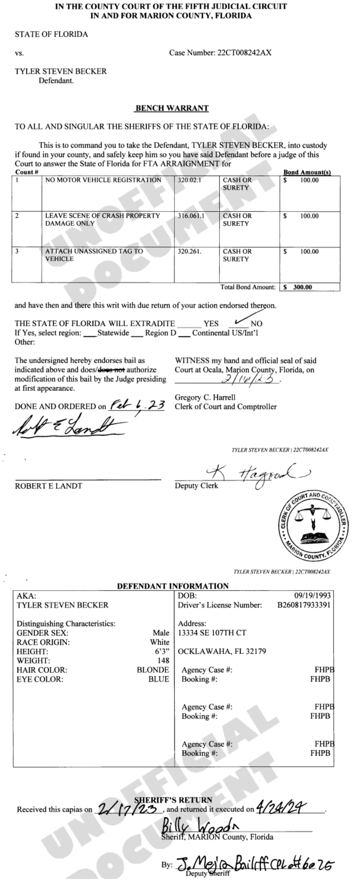 Becker was accused of not having a vehicle registration, leaving the scene of a crash with property damage, and having an unassigned license plate.