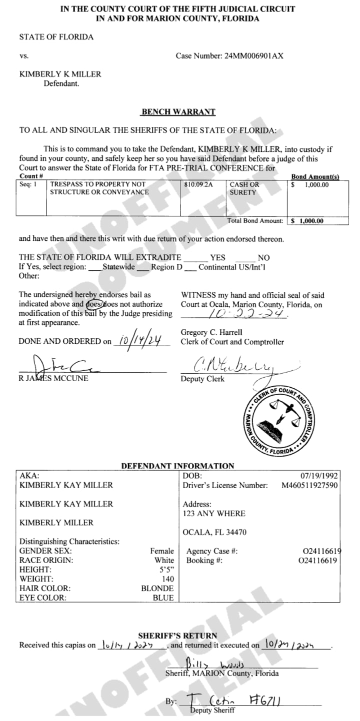 Sheriff’s deputies went to a motel where the security officer said Miller “had returned to the property and entered into Room 122. He advised he recognized this suspect as being formally trespassed” the prior month. Miller was not arrested on July 10, 2021, but she would be this time. The deputies went to her room, knocked on the door, and Miller answered. That’s when she was arrested. On Oct. 1, she pleaded guilty and was sentenced to two days with time served, plus court costs and fines that were sent to collection.