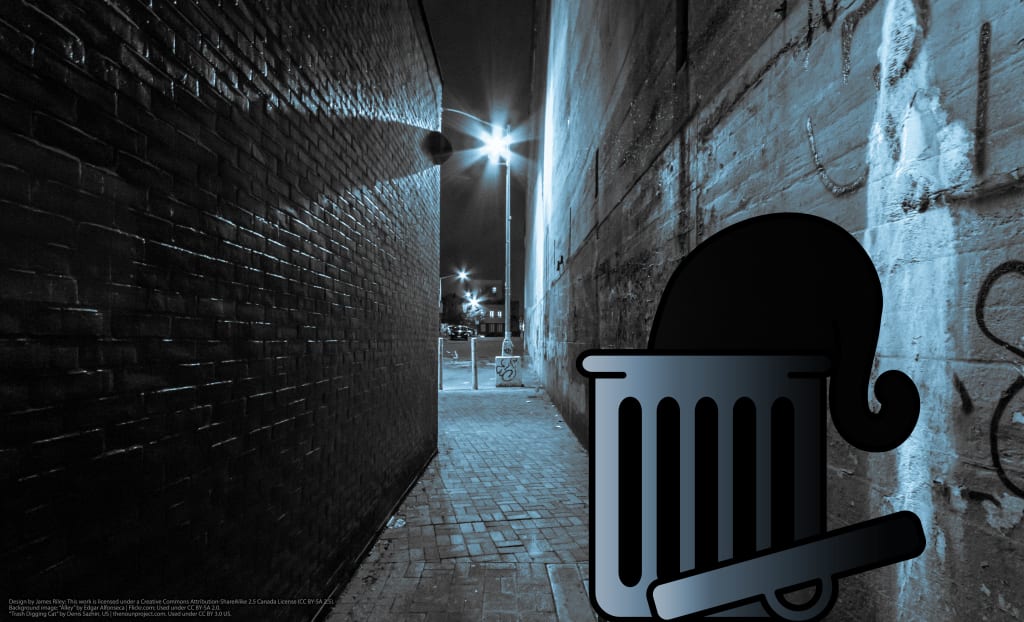 Design by James Riley; This work is licensed under a Creative Commons Attribution-ShareAlike 2.5 Canada License (CC BY-SA 2.5). Background image: “Alley” by Edgar Alfonseca | Flickr.com; Used under CC BY-SA 2.0. “Trash Digging Cat” by Denis Sazhin, US | thenounproject.com. Used under CC BY 3.0 US.
