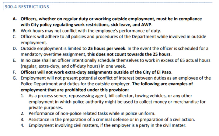 The El Paso Police Department has a Policy and Procedures manual that all officers must follow. This manual includes a section that governs outside employment, often called off-duty employment. You may read the full manual by clicking here.