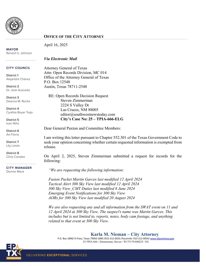 A notification must be made to the Texas Attorney General’s Office to redact the date and time. This City of El Paso notification would indicate what is being redacted and why. In the case of our request, no such notice was made to the AG’s Office. The following is an example of what that notice would look like. To read a complete letter to the AG’s Office, click here.