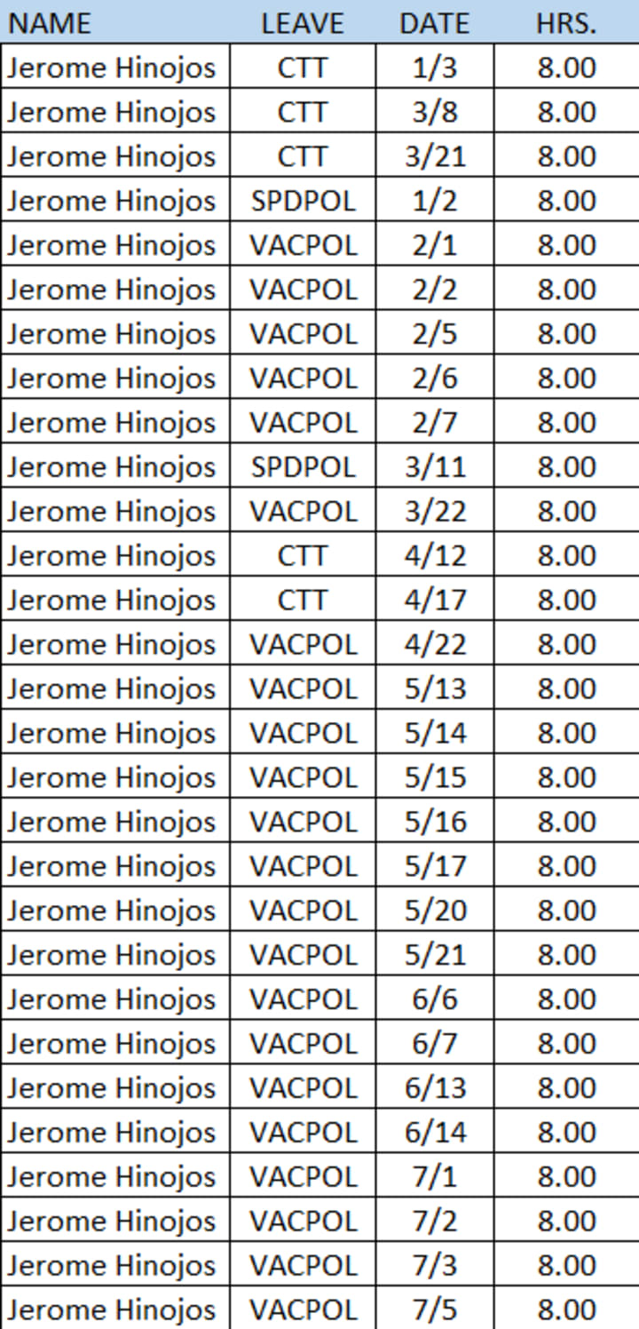 We requested the list of days Hinojos took off, and 20 March 2025 was not one of them.
