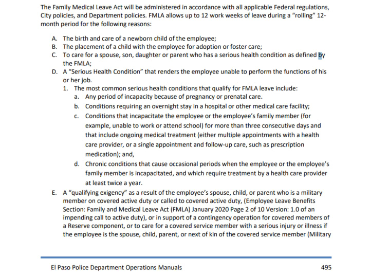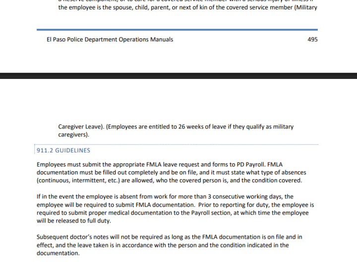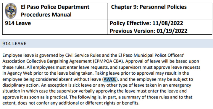 According to the El Paso Police Department Policy and Procedures Manual, Chapter 9: Personnel Policies, 914 Leave, we read: