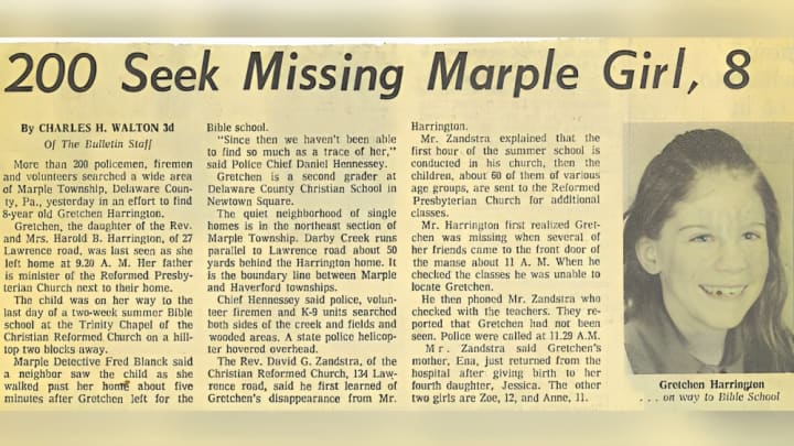 Gretchen Harrington, 8, left her home in Marple Township, Pennsylvania, on the morning of August 15, 1975, intending to walk to summer bible camp. Tragically, she vanished without a trace. Roughly two months later, authorities discovered her skeletal remains in the nearby Ridley Creek State Park.