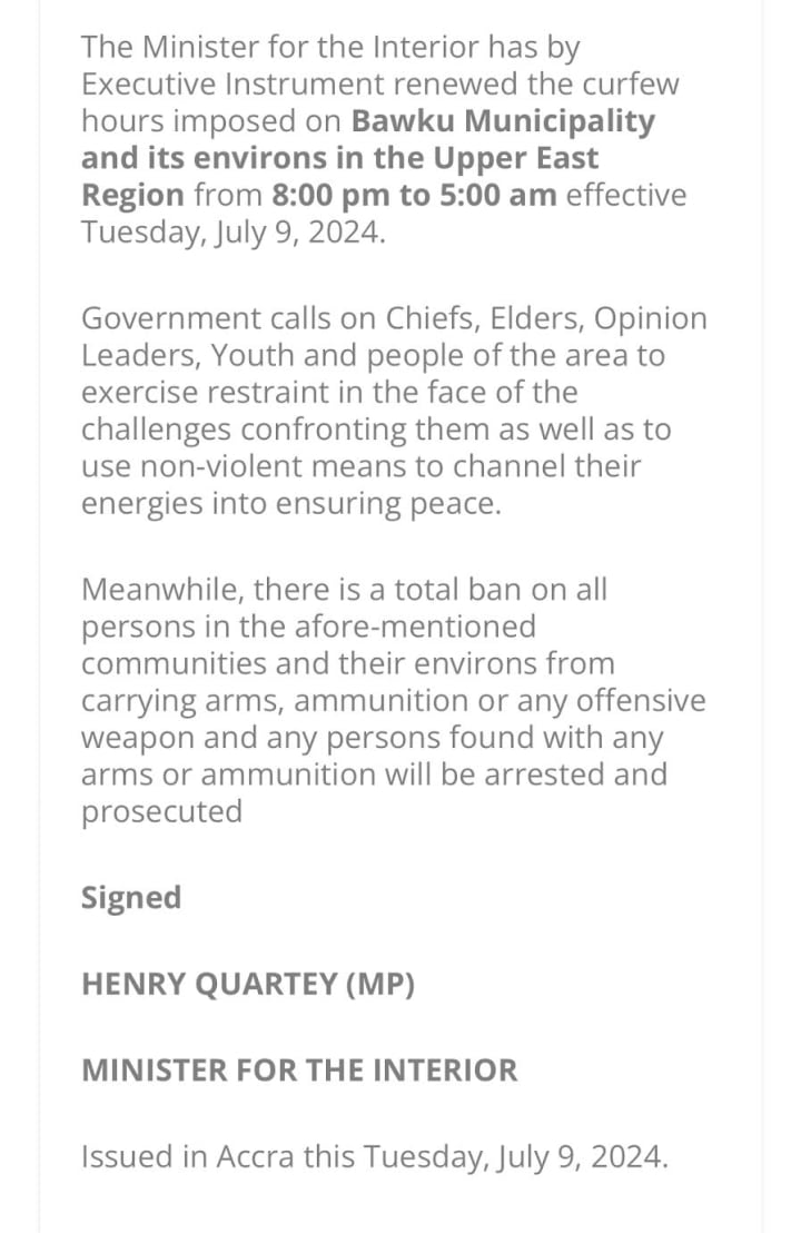 The Minister for the Interior has by Executive Instrument renewed the curfew hours imposed on Bawku Municipality and its environs in the Upper East Region from 8:00 pm to 5:00 am effective Tuesday, July 9, 2024.