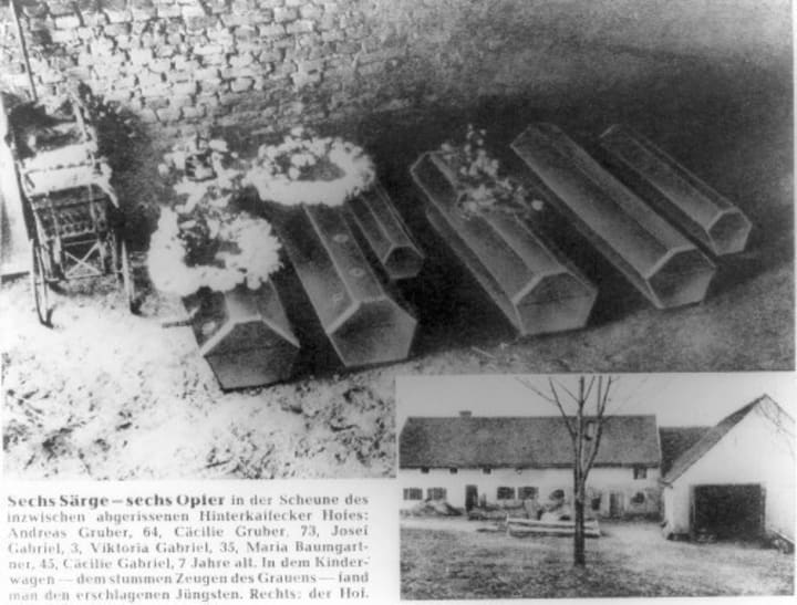 The victims of the Hinterkaifeck murders were Andreas Gruber, his wife Cäzilia, their widowed daughter Viktoria, Viktoria's two children, Cäzilia and Josef, and the family's maid, Maria Baumgartner. Andreas and Cäzilia were in their 60s, while Viktoria was in her 30s, and her children were just seven and two years old. Maria was 44 years old.