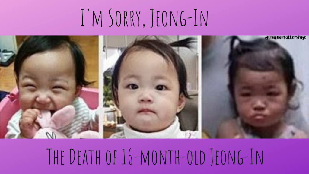On October 13, 2020, 16-month-old Jeong-In, also known by her adoptive name, Ahn Yul-Ha, died due to severe abdominal injuries inflicted by her adoptive mother, Jang Hayeong, and adoptive father, Ahn Sungeun, although he claims that he was unaware of the abuse inflicted by his wife.