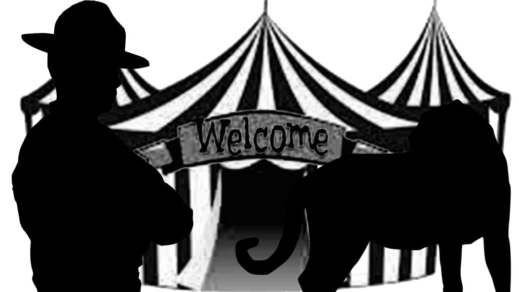 She led me to the main pavilion, an overblown sort of thing half deflated, looked like a giant flower ready to wilt. Out front discarded signs from a recent animal rights protest were scattered about. A clue if ever I saw one. We stepped inside and I glanced around. Weren’t much to see besides the stands and the inner ring where the Ringmaster stood staring at nothing, his back to us. I recognised the look of that back, that was the back of a man who knew everything around him was crumbling, and it set my investigator senses to tingling.