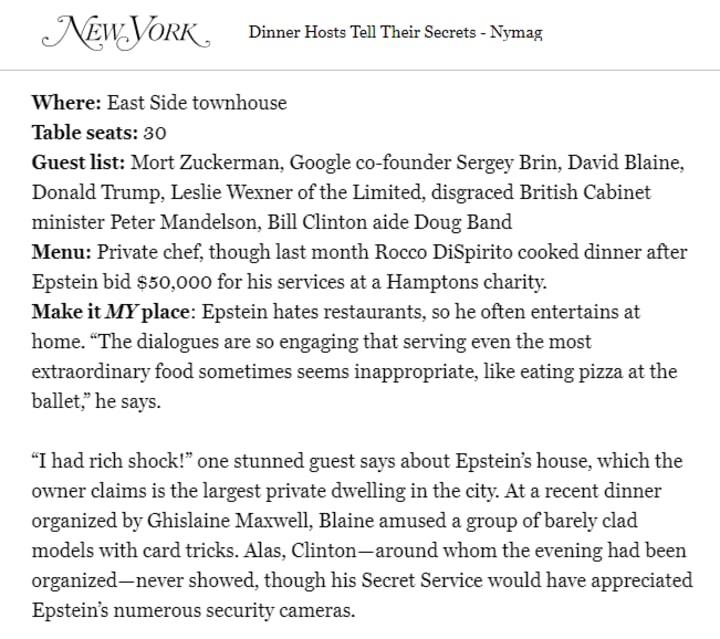 David Blaine's mentioned in the notes at a previous Epstein dinner party. "At a recent dinner organized by Ghislaine Maxwell, Blaine amused a group of barely clad models with card tricks." They even find it note worthy to mention Jeffrey Epstein's many security cameras by saying, "Alas, Clinton—around whom the evening had been organized—never showed, though his Secret Service would have appreciated Epstein’s numerous security cameras." This article is packed full of little hints to what life was really like for the New York elites.