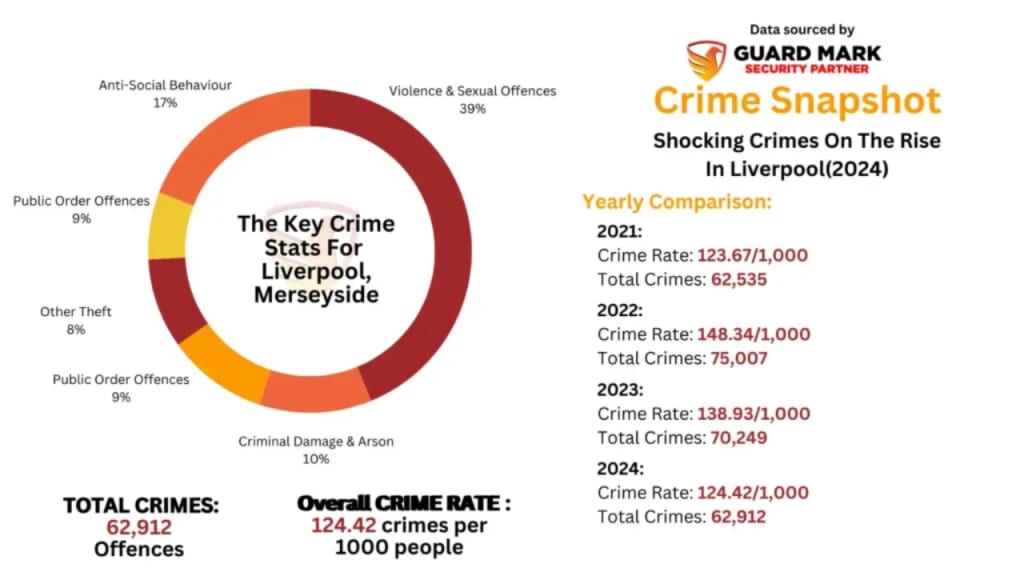 According to Guard Mark Security, the citywide crime rate sits at 124.4 per 1,000 people, making Liverpool one of the more crime-affected cities in the UK. Awareness of these hotspots is vital for informed living and safer business operations.