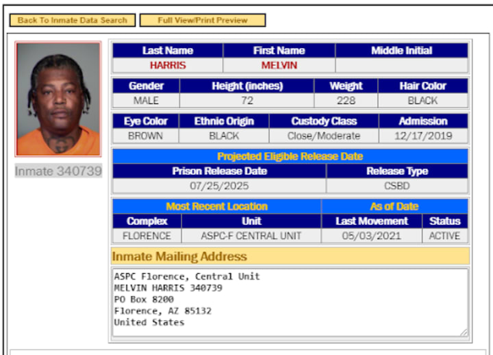 Harris is currently housed at ASPC Florence in Florence, Arizona. He has a projected prison release date of 7/25/2025.