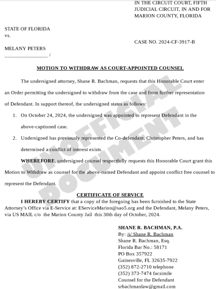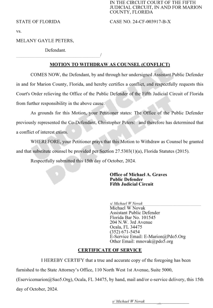 A week after Melany Peters’ public defender asked to quit, the judge allowed a new lawyer from the Office of Regional Counsel but that office filed a Motion to Withdraw because it also “previously represented the co-defendant.”