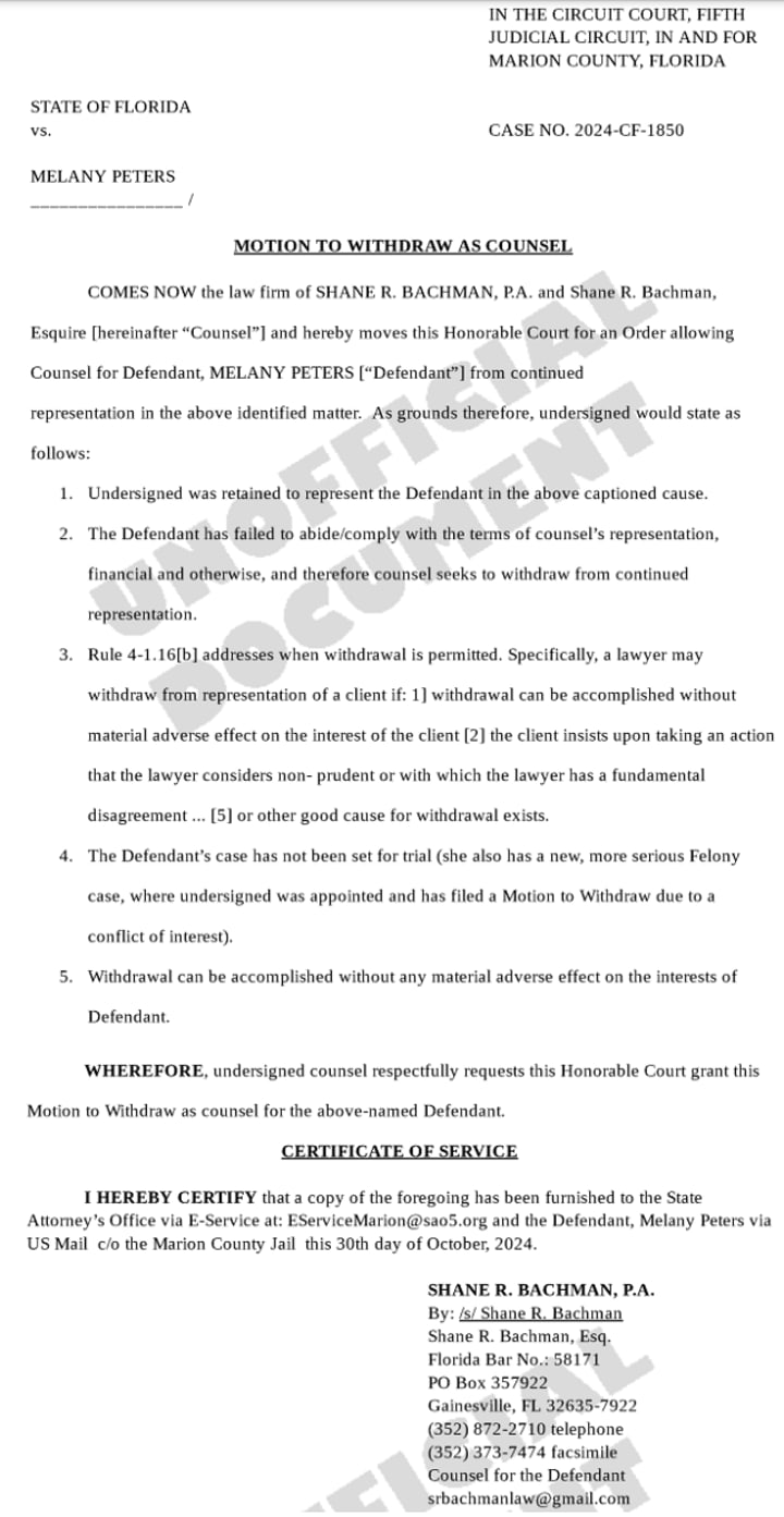 Last but not least, her private lawyer asked to get off the case, claiming Peters “failed to abide/comply with the terms of counsel’s representation,” plus, “She also has a new, more serious Felony case, where the undersigned was appointed and has filed a Motion to Withdraw due to a conflict of interest.”