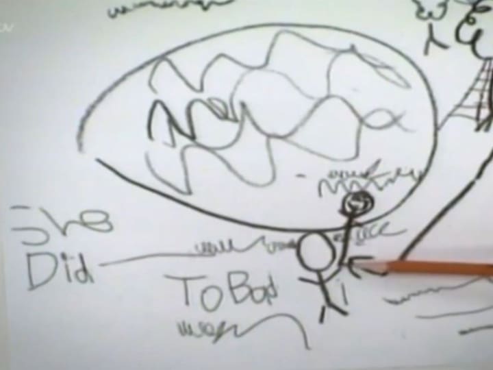 It is stated that A.j. went to child therapists to see what more he knows. While the therapist was speaking to him, he was drawing a picture. The picture was used in court against his mother. It was a small sketch of his back yard. A person in the pool and the person outside of the pool having their hand on the other's face, forcing them in the water. He said it was his mom and sister. He wrote next to his mom's figure, "She did to bad."