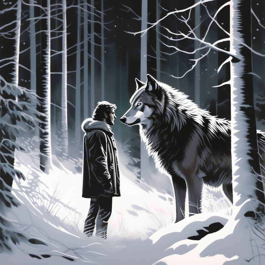 Suddenly, a low growl reverberated through the trees, sending shivers down Nathan's spine. He paused, his senses heightened. The moonlight revealed a magnificent wolf, its fur a mosaic of silver and shadows. The creature's eyes locked onto Nathan's, an ancient wisdom gleaming within them.