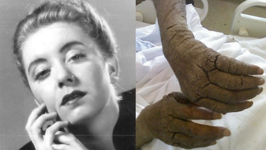 Hospital staff was warned to be careful around her hand for fear that it would fall off. Other parts of her body were crusted over, red, and raw.