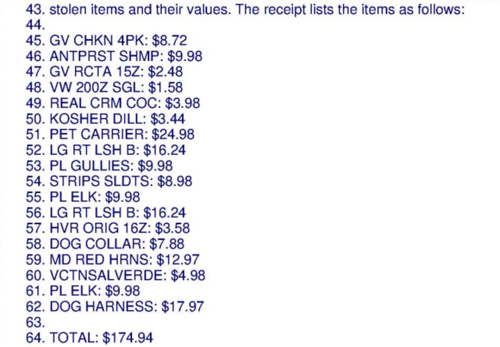 “[The employee] was able to recover all of these stolen items. [He] provided a receipt listing all of the stolen items and their values.” The total was $174.94.
