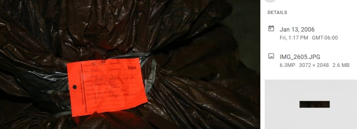 Forensic Anthropologist Dr. Leslie Eisenberg doesn’t write her first report until June of 2006. Bone fragment photos with evidence tags aren't found until January 2006. She stated she worked on the bones prior to this yet the fact is that the first experts we know that analyzed the bones Stier and Bennett both clearly state that the bones originated “from a location unknown to me” and neither documented that a single evidence tag being affixed. They were brought bones in a white cardboard box to assess and give an opinion on. When the tags are not being assigned at the time of the collection and photographs are not taken to show what tag is being assigned to what evidence there is no evidence to corroborate where that evidence is actually originating.