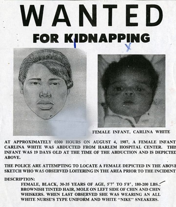 When Carlina was 19 days old, her parents took her to the Harlem Hospital Center with a fever. A woman dressed as a nurse sees baby Carlina, she comforts the parents and takes the baby.