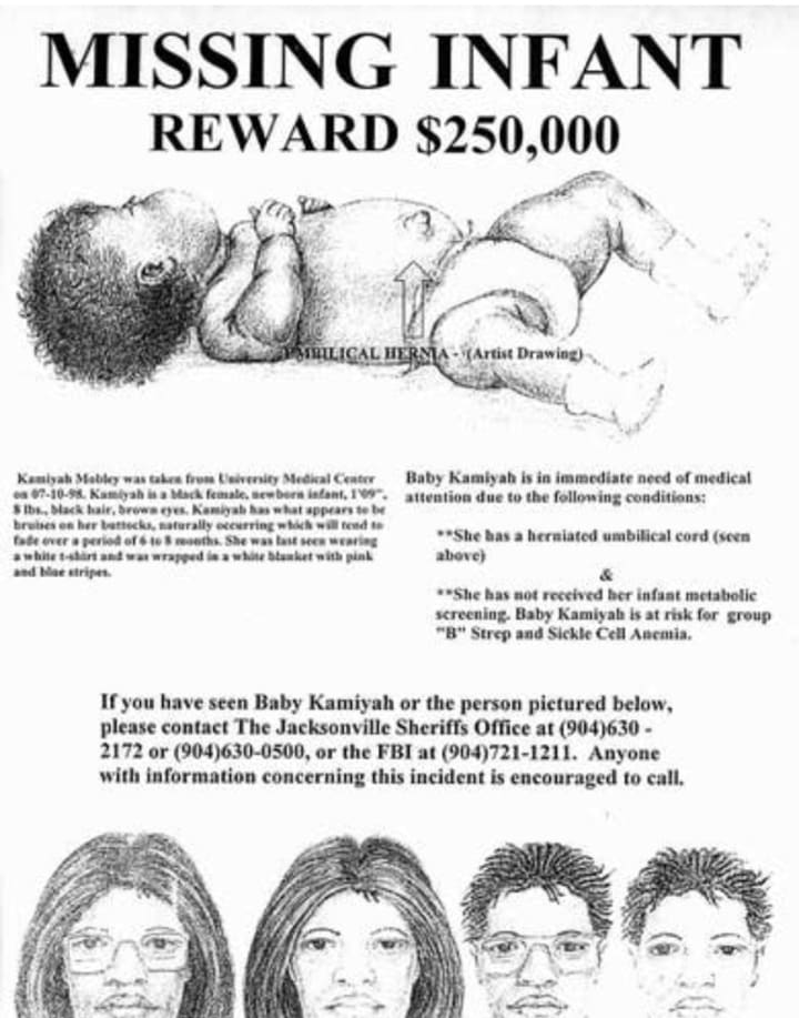 Kamiyah Teresiah Tasha Mobley was born on July 10, 1998, in Jacksonville, Florida. Unlike Carlina's parents, Kamiyah’s mother Shanara Mobley had her when she was 16. Her father Craig Aiken was incarcerated at the time she was born. After she was born, A woman dressed in a nurse attire entered the room, assisted and conversed with the mother, and later walked out of the room with Kamiyah in her arms. Employees initially believed that the woman who kidnapped Kamiyah was a member of the Mobley family. Shanara was interviewed later, pleading for the return of her daughter.