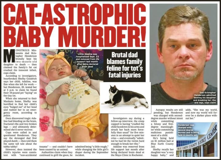 Baby Adaline suffered two broken legs, broken ribs, and a brain bleed. The 39-year-old Henderson told hospital staff the same story he told Shelby- the cat laid on top of the infant, causing the injuries.