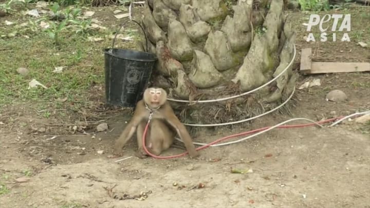 According to the organization, exploited monkeys are generally abducted from their families as infants before being sold to monkey training schools where they are violently trained to pick coconuts.