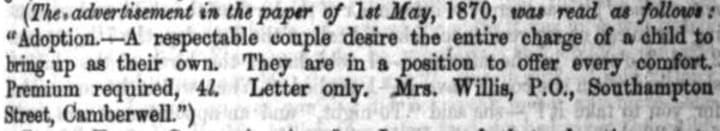 Margaret began by placing adverts in local newspapers, offering to ‘adopt’ children. This commanded a premium of £4 to £10 which was a substantial amount.