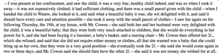 Following an advert in a local newspaper, Robert met with Margaret to discuss what arrangements could be made. Margaret claimed to be a well-off, married woman whose husband was desperate for a child. When Robert explained that he wanted to remain in touch with the child, to know of its progress in life from a ‘suitable’ distance, Margaret willingly agreed.