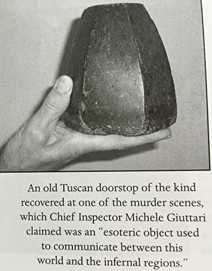 The Italian public found him lacking, disappointing somehow. They much preferred the legend, a monster of their own making: an upper-class doctor elegantly wielding a scalpel to please his shadowy masters with Satanic rituals. Police even found an "arcane relic" at the crime scene, "An esoteric object used to communicate between this world and the infernal regions". It turned out to be the victim's doorstop, pictured below. (Well, I suppose it does look a bit like a 3rd Gen Amazon Echo.)