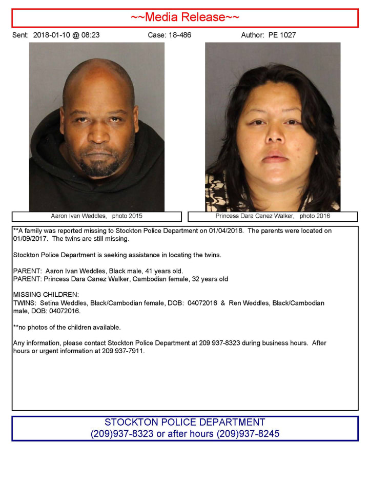 Anyone with information about the missing twins is asked to call the Stockton Police Department at (209) 937-8377, the Investigations Unit at (209) 937-8323 or Crime Stoppers at (209) 946-0600. Crime Stoppers pays cash rewards up to $10,000. Callers can remain anonymous.