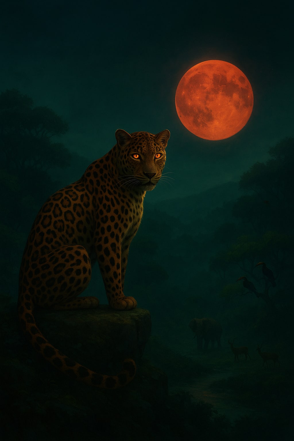 On a night draped in silence, she stepped from the shadows onto the ridge above their camp. Her silhouette was carved against the pale sky, muscles sleek, tail curved like a question. Her eyes glowed, two flames piercing the dark. She did not snarl, nor did she pounce. She simply stood there—an ancient symbol of power, grace, and warning.