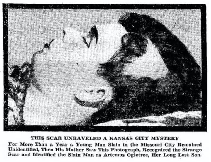 The corpse had borne a strange scar across the scalp which had been inflicted when young Artemus has been burned by hot grease in a household accident. No hair had grown in the spot since, and the strange mark had been used on the front of the papers to help in identification.