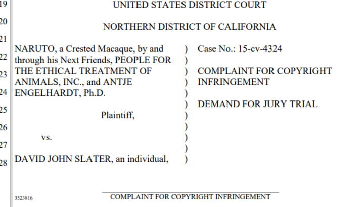 In a separate event, PETA, on behalf of the monkey that they named "Naruto" sued Slater for copyright infringement before the US District Court in California. The trial judge dismissed the case because animals do not have the standing to sue in a court of law.