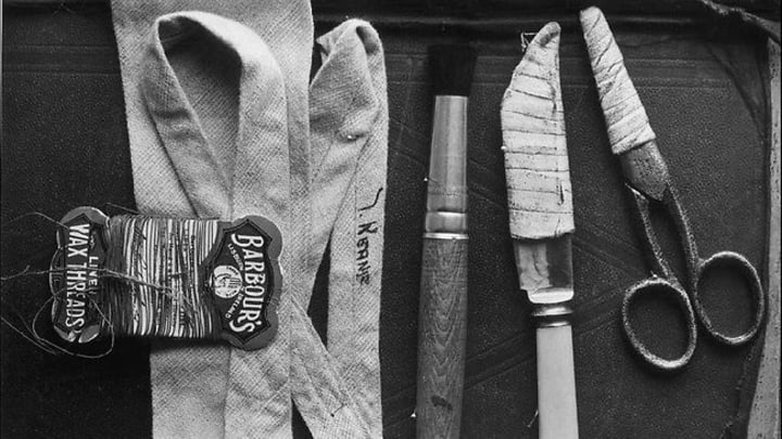 Also within the case was some orange thread that matched those on the Somerton man's trousers. A stencil kit was similar to that officers on board merchant ships used, knives and a coat that looked American in origin.