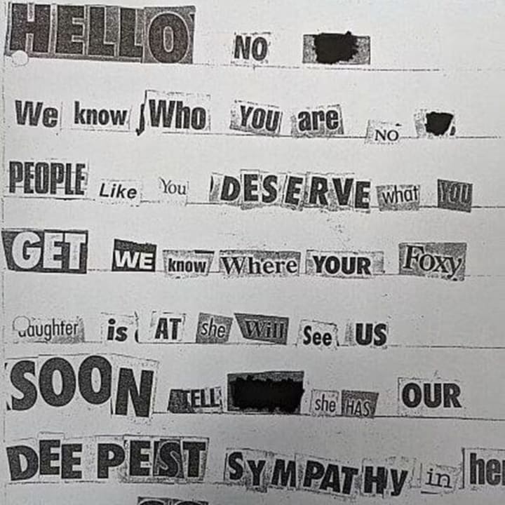 “Hello no (redacted). We know you are no (redacted) people like you deserve what you get. We know where your foxy daughter is at (sic) she will see us soon. Tell (redacted) she has our deepest sympathy in our further loss. Good by (sic) (redacted).”