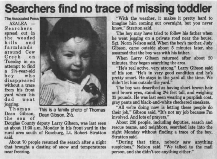 Larry Gibson, an officer with the Douglas County (OR) Sheriff’s Department, told authorities he left his home for a jog around 11:30 a.m. on March 18, 1991, leaving his 2-½-year-old son Thomas alone in the yard. His wife tidied up the house inside. Larry told Tommy to wait outside for his sister Karen to come out to play, then left the home.