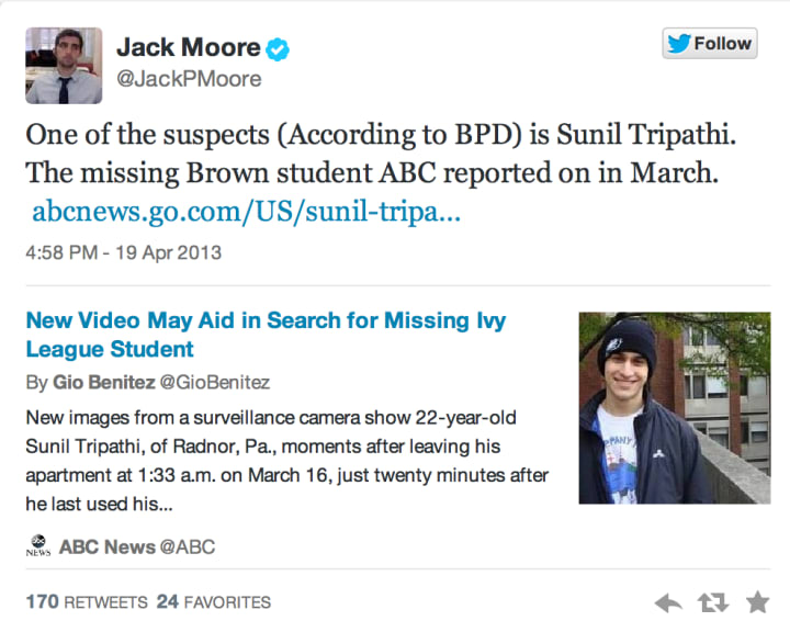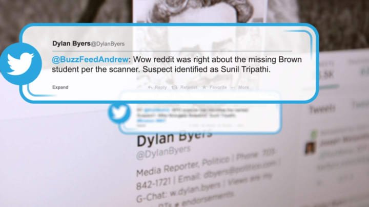 Despite the lack of evidence linking Tripathi to the bombing, the theory gained momentum, and it was eventually picked up by several mainstream media outlets. On April 19, CNN and the New York Post both reported that Tripathi was a suspect in the bombing, citing anonymous sources. BuzzFeed reporter Andrew Kaczynski shared a tweet that named Sunil as the primary suspect from his personal Twitter account.
