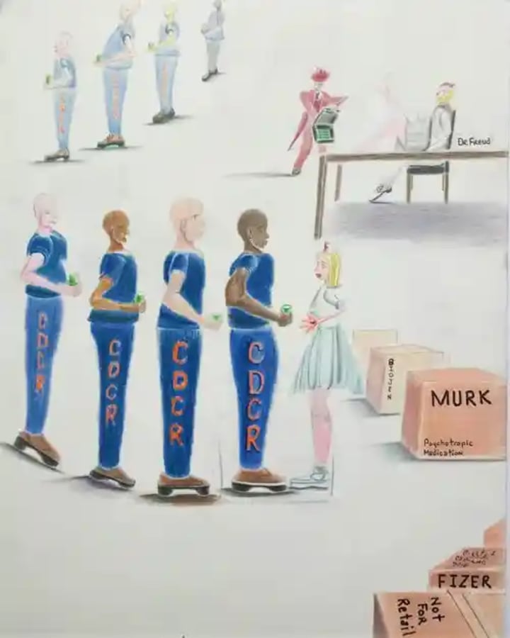 "This piece is part of my broader work on the existential threat of the widespread use of medication inside of America’s prison," says C-Note. "In the foreground, there are wholesale boxes, not for retail, of psychotropic medications from pharmaceutical giants like Merck (“Murk”), Pfizer (“Fizer”), and Biogen (“Biojen”). In the background, there is psychiatrist Dr. Freud harassing a nurse while being offered kickbacks from big pharma."