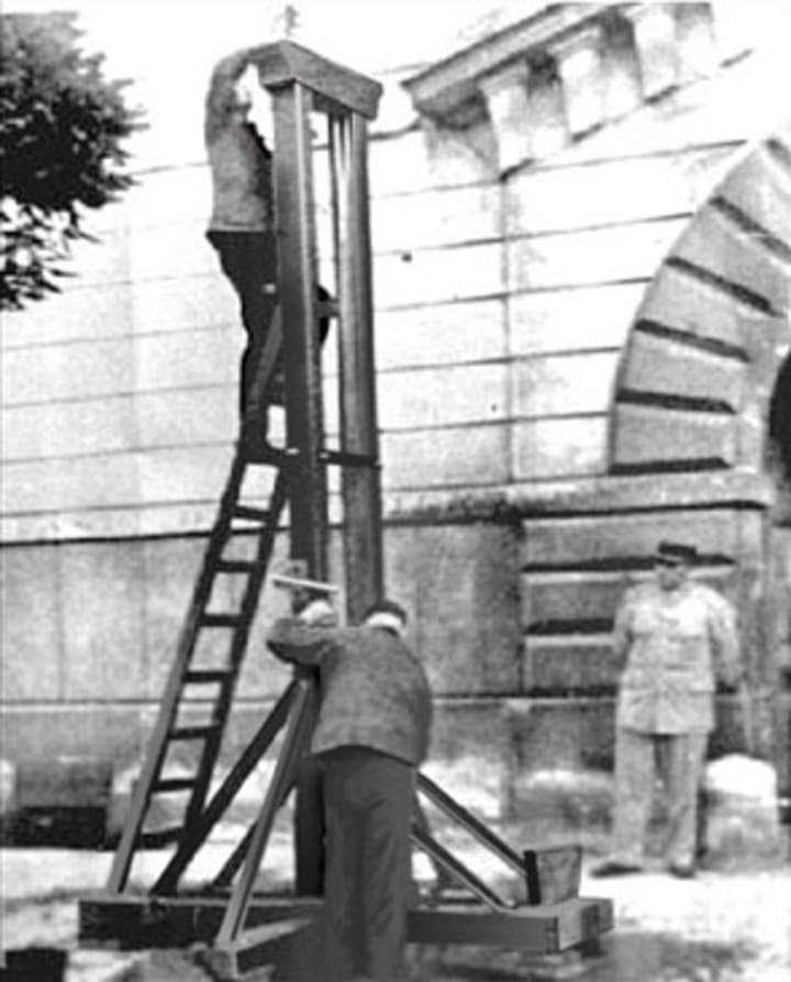 At this point, the crowd was at a fever pitch and one of the executioners pulled the lever, and the blade came soaring down and removed his head into the bin that they placed before the execution started.